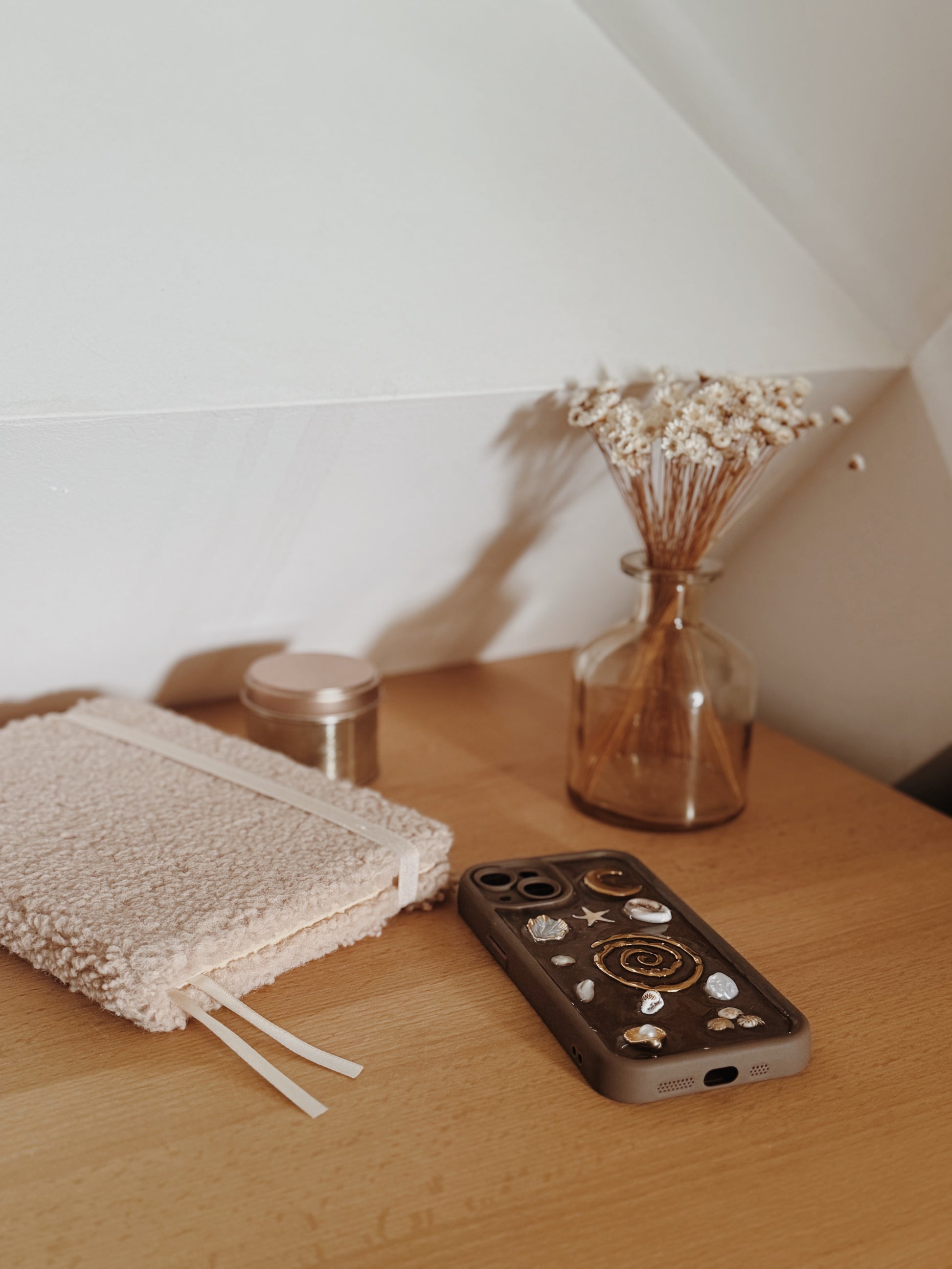 Chaque coque est coulée à la main en Bretagne, avec des coquillages et petits trésors soigneusement sélectionnés. La résine transparente permet un rendu plus résistant, plus lumineux et facile d’entretien.